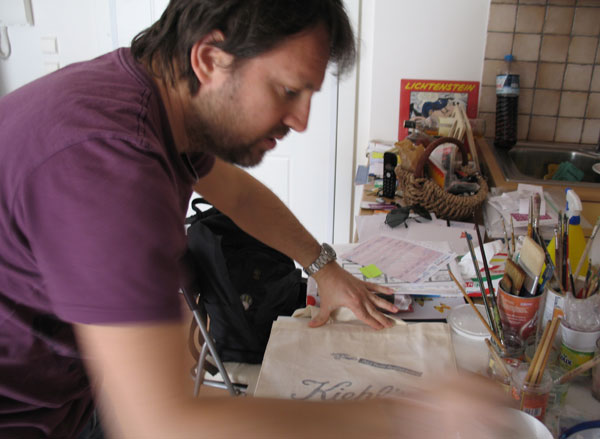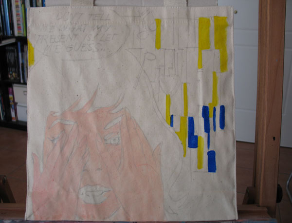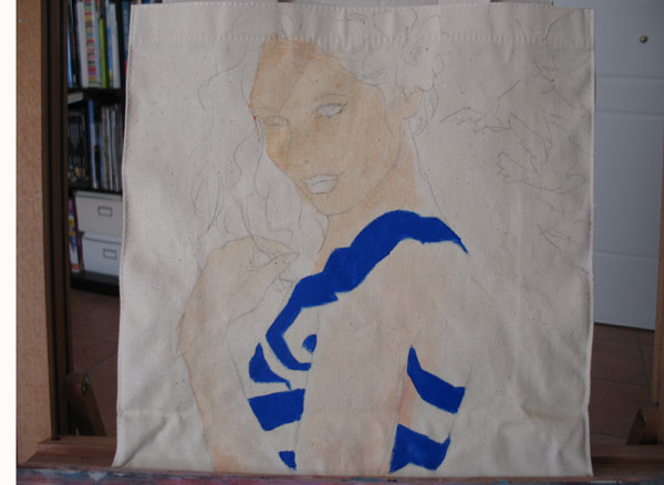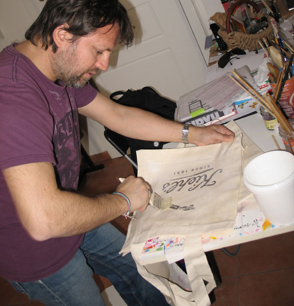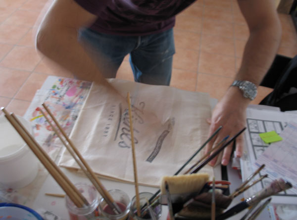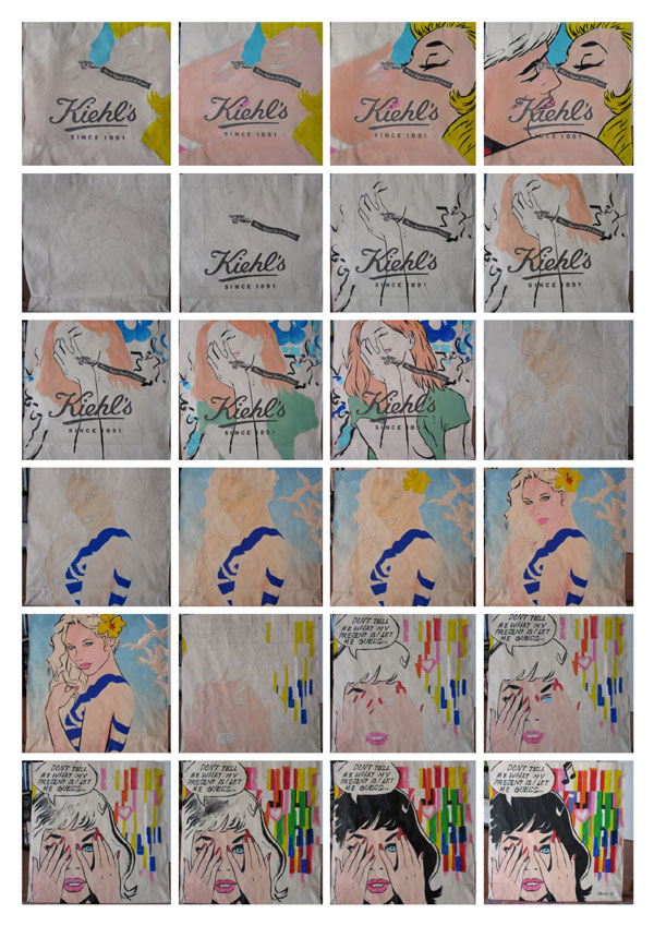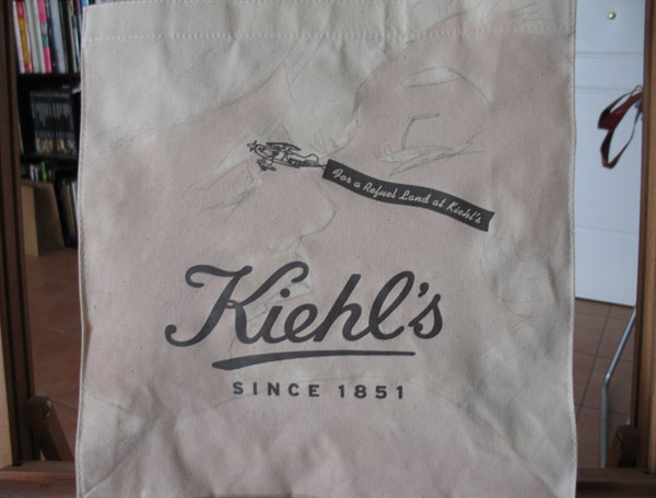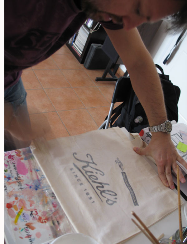 To Σαββατοκύριακο που μας πέρασε, ο Φώτης βρήκε λίγο περισσότερο χρόνο και προχώρησε αρκετά το σχέδιο της tote bag της Kiehl’s. Εγώ φωτογράφιζα τα διάφορα στάδια του χρωματισμού πάνω στις ίδιες τις τσάντες και ο Φώτης για να με διευκολύνει έκανε και μια συνοπτική φόρμα Α4 για να δούμε πως περίπου θα βγουν τα σχέδια. Μετά κρεμάγαμε τις τσάντες και τις αφήναμε λίγο να στεγνώσουν, πριν περάσει ο Φώτης στο επόμενο και νομίζω τελικό στάδιο της δημιουργίας.