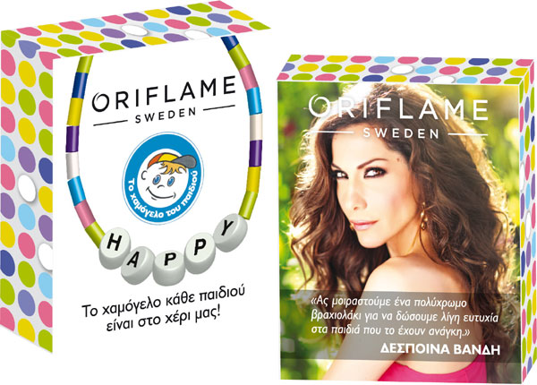Η Oriflame, είναι μια εταιρία που στηρίζει τον φιλανθρωπικό οργανισμό «Το Χαμόγελο του Παιδιού» και δημιουργεί γι αυτόν ακριβώς το σκοπό το βραχιόλι “Happy” το οποίο μπορείτε να βρείτε μέσω του δικτύου της εταιρίας. Τα έσοδα από τις πωλήσεις αυτού του βραχιολιού θα διατεθούν για την ενίσχυση του οργανισμού και μένα μου άρεσε πάρα πολύ η φράση της εταιρείας «Το χαμόγελο κάθε παιδιού είναι στο χέρι μας» για να το προωθήσει.