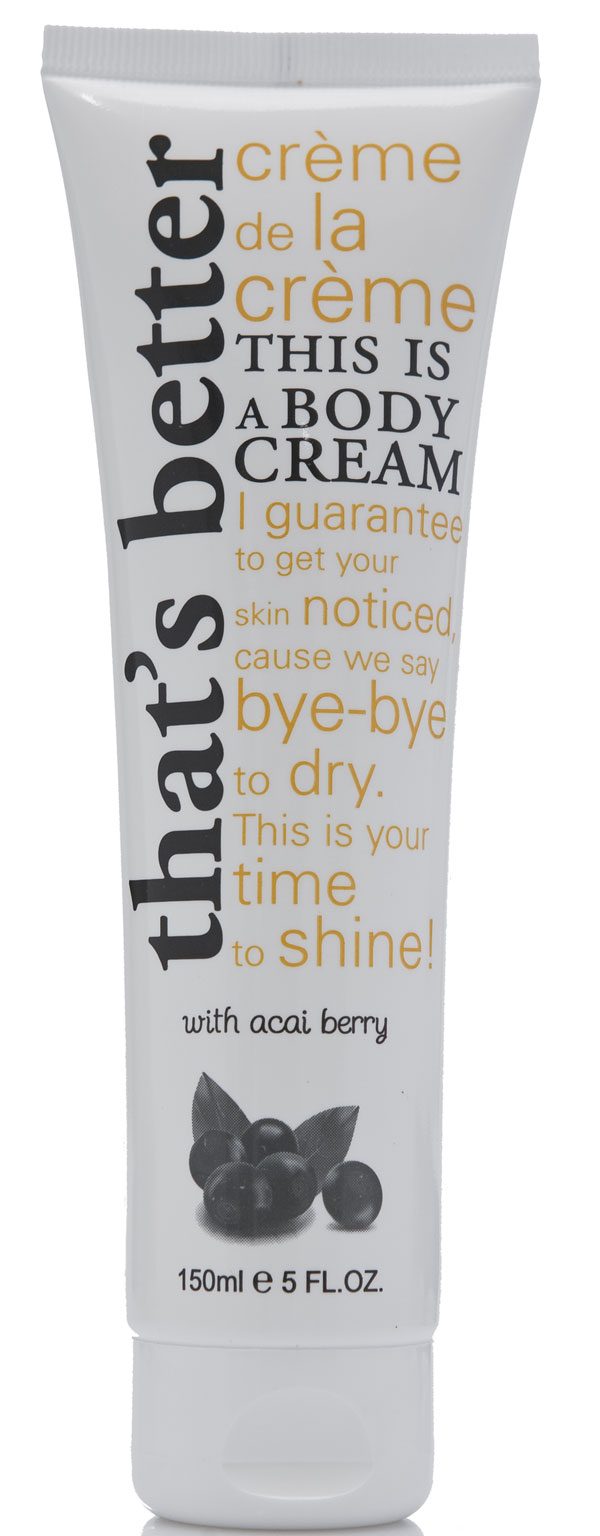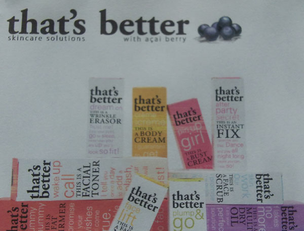Τα προϊόντα That’s Better, είναι βασισμένα σε φυσικές φόρμουλες (χωρίς parabens, σιλικόνες, Propylene Glycol ,PEG κλπ) και σε όλα ο πρωταγωνιστής είναι το Accai Berry μαζί με Βιταμίνες B, C, E, αμυγδαλέλαιο, αιθέρια έλαια, κλπ.
