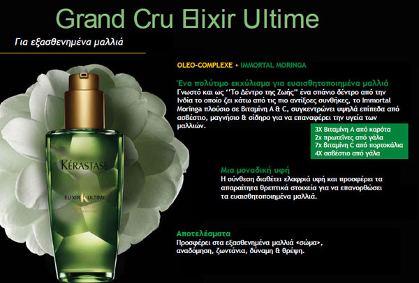 “Η σειρά Kerastase Elixir Ultime ‘’Grands Crus’’, αποτελεί μια μοναδική δημιουργία που γεννήθηκε μέσα από τη μαγική συνένωση σπάνιων & πολύτιμων εκχυλισμάτων που έχουν συλλεχθεί από τη φύση με τη μεγαλύτερη δυνατή φροντίδα. Το θρυλικό Σύμπλοκο-Ελαίων, OLEO-COMPLEXE αναμειγνύεται με αυτά τα πολύτιμα εκχυλίσματα για να δημιουργήσει προσωποποιημένα έλαια για κάθε τύπο μαλλιών.”