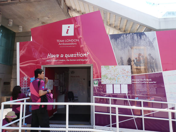 Περίπτερα, στημένα σε όλο το Λονδίνο με τους εθελοντές να δίνουν πληροφορίες για την πόλη και τους Αγώνες