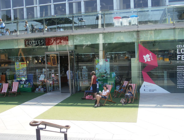 Έξω από το βιβλιοπωλείο Foyles στο South Bank, όπου μπορείς να πάρεις ένα βιβλίο και να το διαβάσεις έξω καθισμένος σε σαιζλόγκ