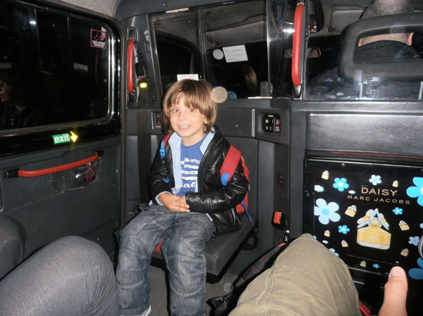 Κατάκοποι αλλά χαρούμενοι, μεσα σε London Taxi με διαφήμιση το άρωμα Daisy του Marc Jacobs!