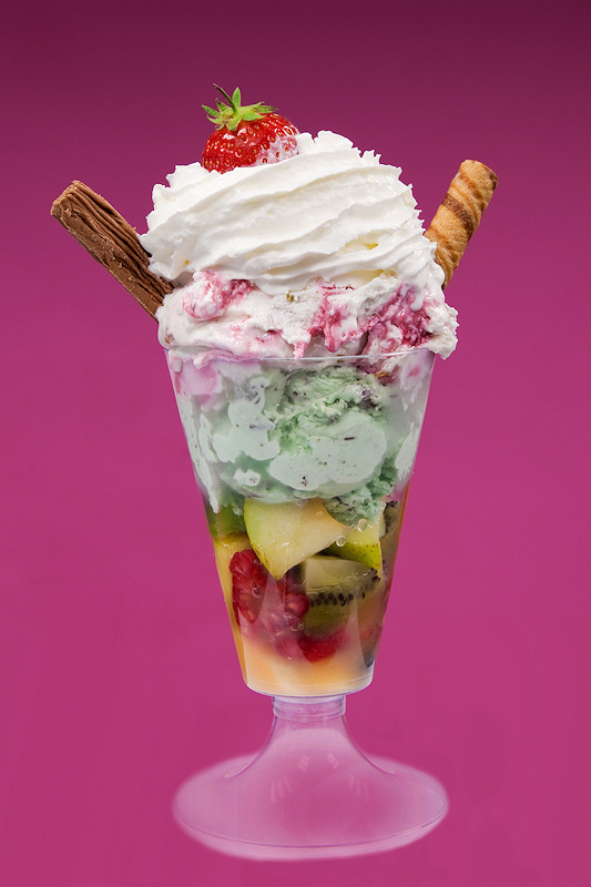 Μετά από κανένα δεκάλεπτο, είδα από το βάθος της αίθουσας να έρχεται το γκαρσόνι με κάτι που δεν είχα ξαναδεί στην μέχρι τότε ζωή μου… Ένα τεράστιο ψηλό γυάλινο ποτήρι, που μέσα είχε όλα τα χρώματα του ουράνιου τόξου… κίτρινο, κόκκινο, ροζ, μοβ, πράσινο, γαλάζιο, πορτοκαλί, σε στρώσεις, με φρούτα, με μπόλικη σαντιγί, πασπαλισμένο με κάτι χρωματιστά ψιχουλάκια (έτσι τα έβλεπα τότε…) και από πάνω καρφωμένα παιγνιδάκια, μικροί ακροβάτες που αναποδογύριζαν, σημαιούλες, ομπρελίτσες, μικρά βεγγαλικά που έβγαζαν αστράκια… το….
