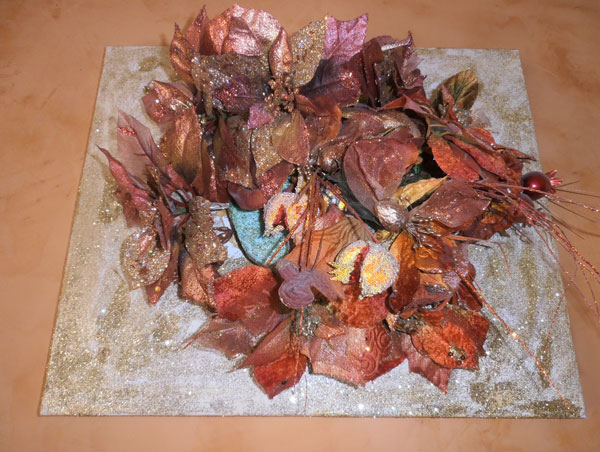 Αυτό που βλέπετε παρακάτω το έφτιαξε πριν από λίγα χρόνια κάποια Χριστούγεννα ο aka μπαμπάς, με τελάρο, χρυσόσκονη και υφασμάτινα λουλούδια. Μου άρεσε τόσο πολύ, που δεν το ξεκρέμασα από τότε, το έχω πάνω από το τζάκι μόνιμα. Το είδε η Βίκυ, ξετρελάθηκε και μετά έφτιαξε άλλο ένα ο κύριος Ντίνος και για το δικό της σπίτι, με άλλες αποχρώσεις.