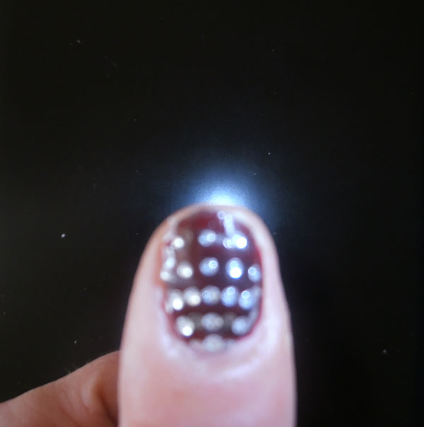 Και για του λόγου το αληθές, να το sticker που δοκίμασα εκείνη τη στιγμή, πάνω από το σκούρο μοβ βερνίκι νυχιών (λίγο θολό, αλλά καταλάβατε, έ ούτε το ζωγραφικό, ούτε το φωτογραφικό έχω…τι να κάνω τώρα, δηλαδή;)