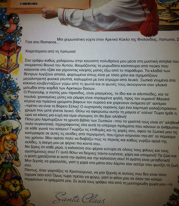 Ένα βράδυ πριν από 15 μέρες περίπου, η Αλεξάνδρα, μου είπε να περιμένω κάτι στο σπίτι μου, από το ταχυδρομείο. Όχι για μένα. Για τον κύριο Ρωμανό! Ένα γράμμα, σταλμένο απ’ ευθείας από τον Santa Claus από τον Αγιο Βασίλη από το Suomi (Φινλανδία) από το χωριό του! Το λάβαμε! Το διαβάσαμε!! Το έχουμε κάτω από το δέντρο μας και ο μικρός μου, τόσο ξετρελαμένος, το είπε σε όλους του, τους φίλους στο σχολείο! (και θα το κρατήσουμε, βέβαια για πάντα και ίσως μια μέρα, ο ίδιος, το διαβάσει στα δικά του παιδιά..)