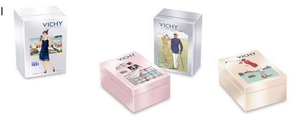 Λοιπόν, σε επιλεγμένα φαρμακεία, θα βρείτε τα 4 συλλεκτικά α- λα, vintage, μεταλλικά κουτιά της Vichy τα οποία εμπνέονται από την ιστορία της Vichy που ξεκινά το 1931. Κάθε κουτί περιλαμβάνει την κρέμα ημέρας, για την δική σας ηλικία και της δικές σας ανάγκες, το αντηλιακό προσώπου Capital Soleil SPF 30 καθώς και ένα δείγμα του make up Dermablend.